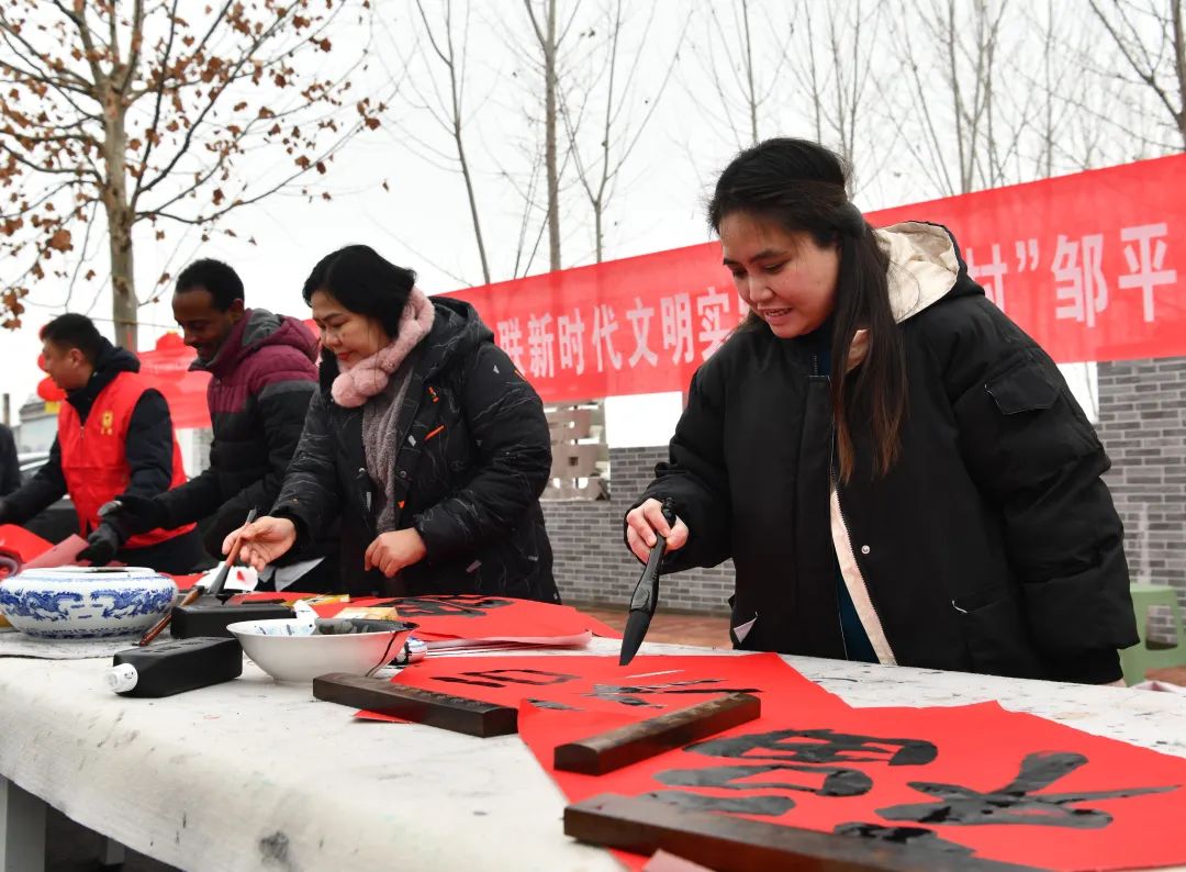 1月18日上午,2024春節(jié)山東鄉(xiāng)村文化旅游節(jié)鄒平啟動儀式在九戶鎮(zhèn)舉行,同步啟動2024年文化科技衛(wèi)生三下鄉(xiāng)和冬季黃河大集。來自菲律賓、蘇丹、喀麥隆等國家的在鄒外國友人走上黃河大集,品美食、寫福字,品味鄒平獨特的濃郁年味。
