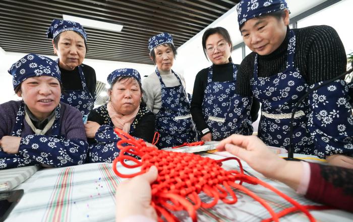 12月25日,教師在鄒平市黛溪街道一職業(yè)培訓學校內(nèi)教授學員編織中國結(jié)。