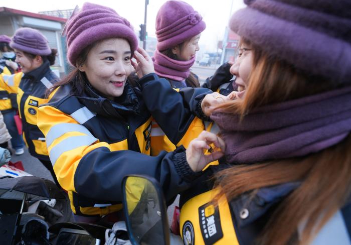 1月12日,鄒平市美團外賣員試戴婦聯(lián)一早送來的帽子和圍巾,準備開始一天的外送工作。