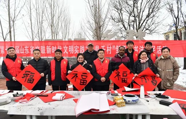 1月18日,來自菲律賓、蘇丹等國家的外國友人,在山東省濱州市鄒平市九戶鎮(zhèn)黃河大集與書法志愿者合影留念。