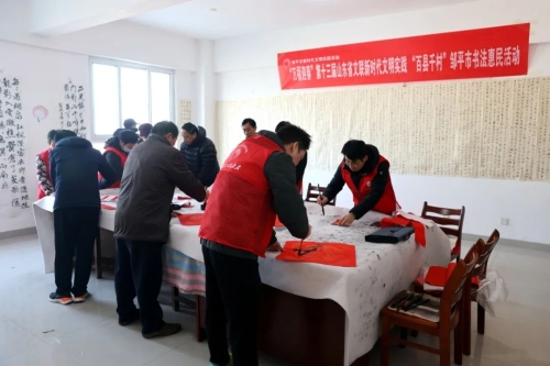 揮毫潑墨送祝福,妙手丹書(shū)賀新春。1月26日,第十三屆山東省文聯(lián)新時(shí)代文明實(shí)踐“百縣千村”鄒平市書(shū)法惠民活動(dòng)走進(jìn)青陽(yáng)鎮(zhèn)西窩陀村,為群眾免費(fèi)寫(xiě)春聯(lián),送上一份美好的春節(jié)前祝福。