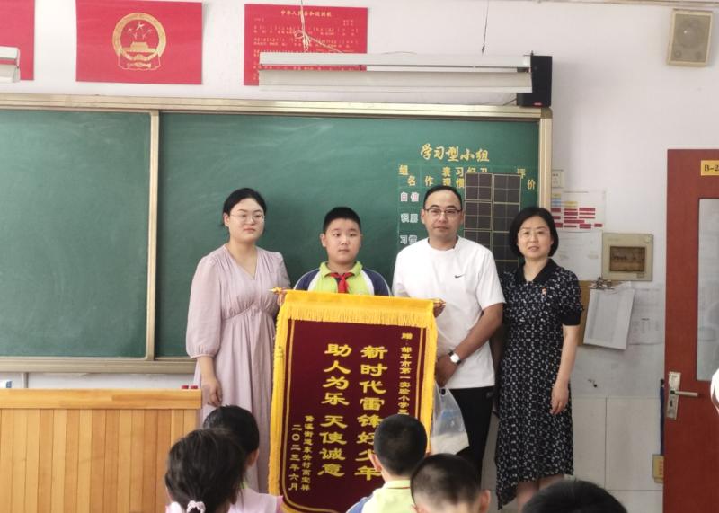 6月28日一早,鄒平市民高先生將一面寫著“新時代雷鋒好少年 助人為樂 天使誠意”的錦旗交到了鄒平市第一實驗小學三年級學生盧家駒同學的手里,感謝這位好少年對家中老人施以援手。
