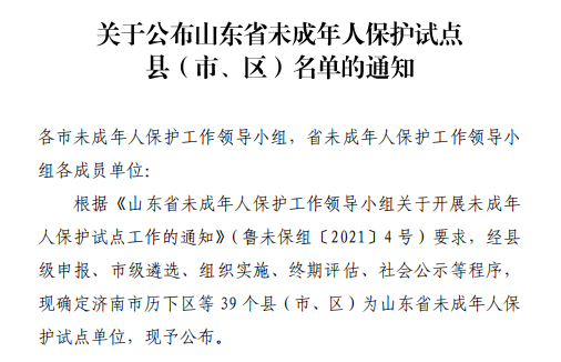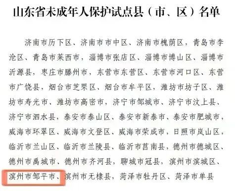 近日,山東省民政廳下發(fā)《關(guān)于公布山東省未成年人保護(hù)試點(diǎn)縣(市、區(qū))名單的通知》,公布省未成年人保護(hù)試點(diǎn)縣(市、區(qū))名單,鄒平市榜上有名。