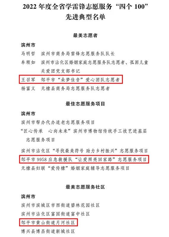 為充分發(fā)揮先進(jìn)典型的示范帶動作用,2022年11月,省文明辦、省總工會、團(tuán)省委、省婦聯(lián)、省文聯(lián)、省科協(xié)、省殘聯(lián)、省社科聯(lián)、省民政廳、省生態(tài)環(huán)境廳、省農(nóng)業(yè)農(nóng)村廳、省文化和旅游廳、省衛(wèi)生健康委、省退役軍人事務(wù)廳、省應(yīng)急管理廳、省國資委、省紅十字會組織開展2022年度全省學(xué)雷鋒志愿服務(wù)“四個(gè)100”先進(jìn)典型宣傳推選活動。經(jīng)過宣傳發(fā)動、層層推薦、嚴(yán)格審核、專家評選、網(wǎng)上公示等環(huán)節(jié),最終評選出了100名“最美志愿者”,100個(gè)“最佳志愿服務(wù)組織”,100 個(gè)“最佳志愿服務(wù)項(xiàng)目”,100個(gè)“最美志愿服務(wù)社區(qū)”。其中鄒平市榮獲三項(xiàng)省級志愿服務(wù)榮譽(yù)稱號。