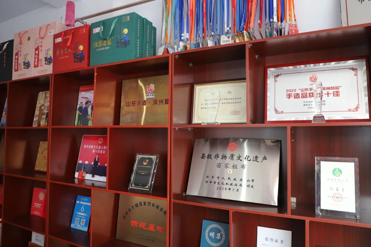 2019年孫春香入選中央文化和旅游部旅游能人支持項目,同年,被評為鄒平市大姐工坊,濱州市巾幗脫貧就業(yè)示范基地;2022年榮獲濱州市非遺傳承人,粗布產(chǎn)品入選山東手造優(yōu)選100,成為好客山東,好品山東主推的手造特色品牌;2023年,漢家老苗百年老品牌成功入選濱州市老字號,并榮獲山東手造濱州精品十佳手造品牌、齊魯鄉(xiāng)村之星、齊魯最美巾幗手工匠人、山東省最美鄉(xiāng)村女致富帶頭人等榮譽(yù)稱號。
