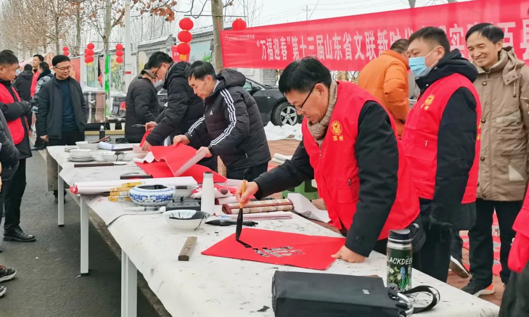 開(kāi)展“萬(wàn)福迎春”第十三屆山東省文聯(lián)新時(shí)代文明實(shí)踐“百縣千村”鄒平市書(shū)法惠民活動(dòng),來(lái)自市文聯(lián)的志愿者現(xiàn)場(chǎng)創(chuàng)作,將寓意著吉祥與美好祝福的春聯(lián)贈(zèng)予群眾。